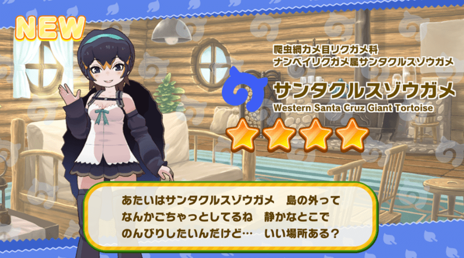 けものフレンズ3の『サンタクルスゾウガメすてっぷあっぷしょうたい』にて、新フレンズ「サンタクルスゾウガメ」が登場した。