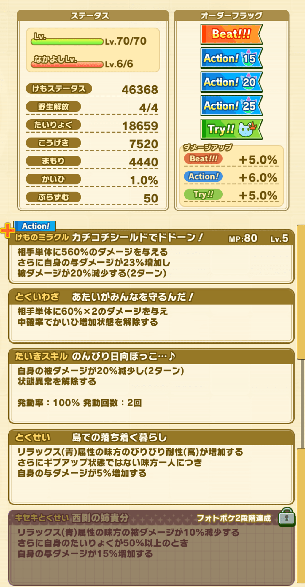 けものミラクルと待機スキルは継続ターンが短いものの強化値は大きいので、相手のけものミラクルや敵の大技に合わせて発動させておくと被害を抑えられる。