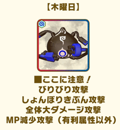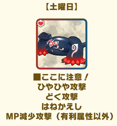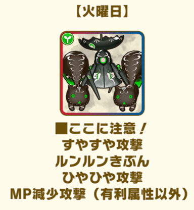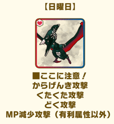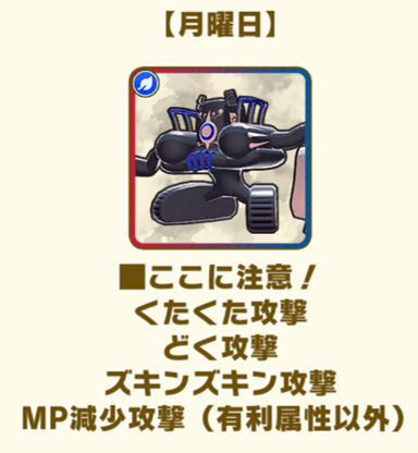 前列攻撃に加え、大技のくたくた攻撃が非常に強烈でくたくた状態にさせられると継続ターンが5ターンとかなり長く、けものミラクル不発でバトルが終わることになる。