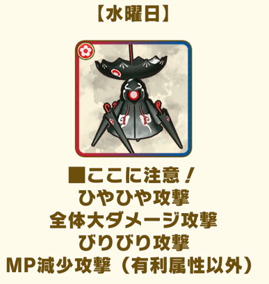 ひやひや攻撃の頻度が高く、大技は全体攻撃範囲のひやひや付与であるため、耐性はパーティ全体に必要となる。