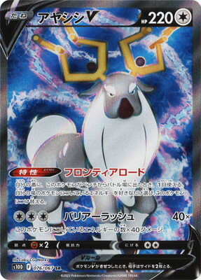 「アヤシシV」も特性「フロンティアロード」で自分の場のポケモンのエネルギーを「アヤシシV」に付け替えることができるので、エネルギーが溜まったら「アヤシシV」に交代し、そのまま「バリアーラッシュ」でダメージを稼ぐこともできる。